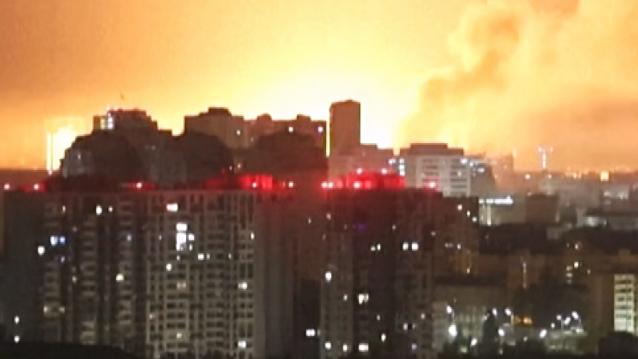 키이우의 밤하늘을 가로지르더니 미사일이 그대로 도시에 내려꽂힙니다.
