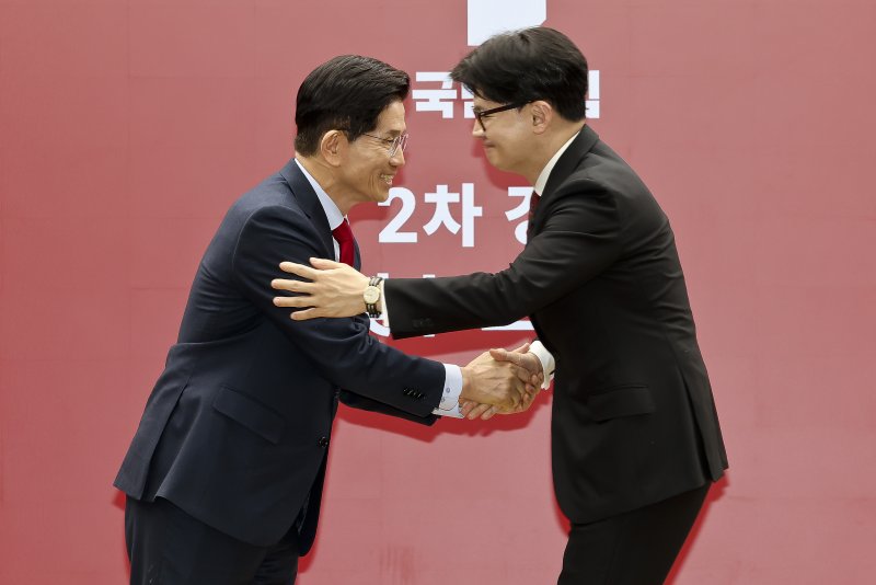 제21대 대통령 선거 국민의힘 경선 후보가 23일 오후 서울 여의도 국민의힘 중앙당사에서 열린 2차 경선토론회 미디어데이에서 한동훈 후보를 맞수토론 상대로 지목한 뒤 포옹하고 있다. 2025.04.23. /사진=뉴시스 |