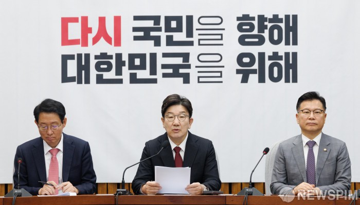 [서울=뉴스핌] 윤창빈 기자 = 권성동 국민의힘 원내대표가 25일 오전 서울 여의도 국회에서 열린 원내대책회의에서 모두발언을 하고 있다. 2025.04.25 pangbin@newspim.com