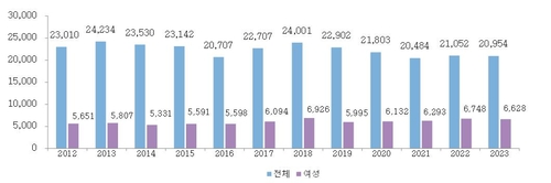 2023년 재직여성 규모는 전년 대비 1천670명 늘어난 6만1천430명으로 비율은 전년 대비 0.4% 포인트 늘어난 23.1%로 조사됐다.
