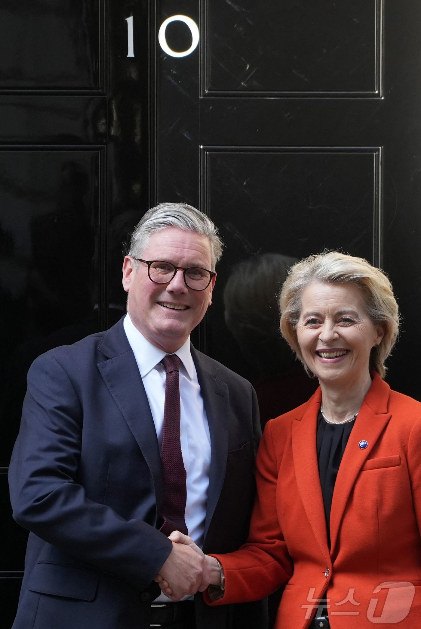 (런던 AFP=뉴스1) 우동명 기자 = 키어 스타머 영국 총리와 우르줄라 폰데어라이엔 EU 집행위원장이 24일(현지시간) 런던 다우닝가 10번지 앞에서 악수를 하고 있다. 2025.04.25 ⓒ AFP=뉴스1