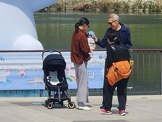 공개된 사진에서 김민희로 추정되는 여성이 아기를 품에 안고 있고, 홍상수가 이를 바라보며 미소 짓고 있다. 이들 옆엔 유모차가, 앞에는 중년 여성이 서 있다.