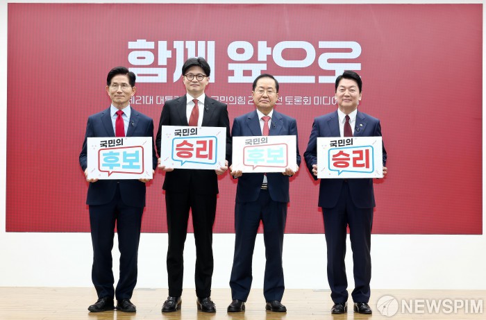 [서울=뉴스핌] 윤창빈 기자 = 국민의힘 김문수·안철수·한동훈·홍준표 경선 후보가 23일 서울 영등포구 중앙당사에서 열린 제21대 대통령후보자 선출을 위한 2차 경선 토론회 미디어 데이에서 기념촬영을 하고 있다. 2025.04.23 pangbin@newspim.com |