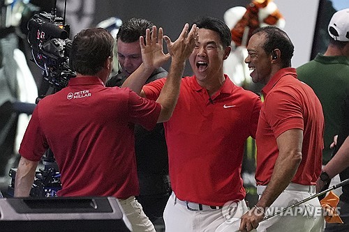 TGL 경기에서 기뻐하는 김주형(가운데)과 타이거 우즈(오른쪽) |