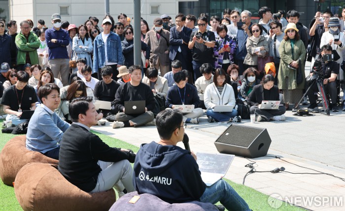 [성남=뉴스핌] 김학선 기자 = 안철수 국민의힘 대선 경선 후보와 이준석 개혁신당 대선 후보가 25일 경기도 성남 판교역 앞 광장에서 '안철수X이준석, 미래를 여는 단비토크'를 진행하고 있다. 두 후보는 이날 'AI 기술패권시대 대한민국 미래를 말하다'라는 주제로 토크콘서트를 열었다. 2025.04.25 yooksa@newspim.com |