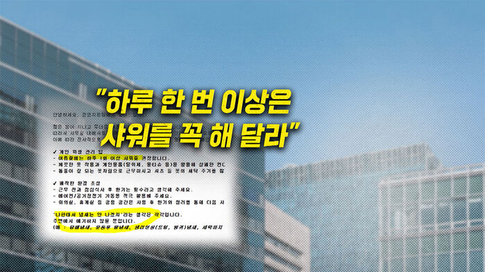 공지문을 보면 이 회사는 쾌적한 근무 환경을 조성하기 위해 청결 관리 캠페인을 하고 있는데, 직원들에게 여름철에는 하루 1회 이상 샤워를 권장한다며, 깨끗하고 통풍이 잘되는 옷차림으로 근무하고, 또 옷의 세탁 주기를 짧게 해달라고 당부했습니다.