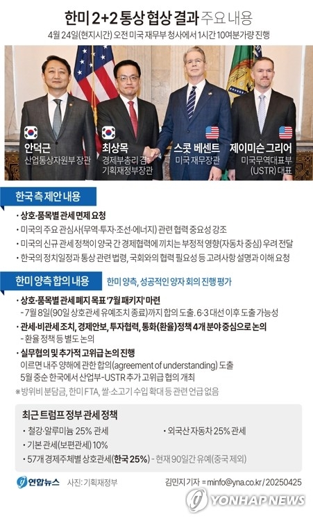 한국 정부는 속도전을 강조해 온 미국으로부터 ‘7월 패키지(7월8일 이전까지 타결)’ 합의를 이끌어냈다는 점을 이번 만남의 성과로 내세우고 있지만, 각 사안에서 전면화될 미국 압박을 어떻게 이겨낼지가 과제다.