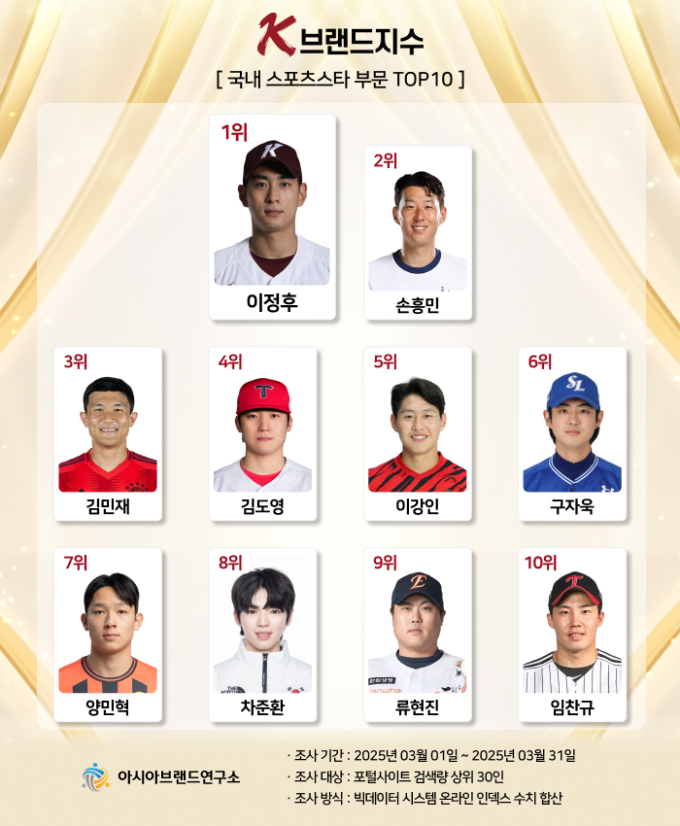 아시아브랜드연구소는 포털사이트 검색량 상위 30명의 스포츠 스타를 대상으로, 지난달 온라인 빅데이터 1억7620만 건을 분석했다. 이정후 손흥민의 뒤를 이어 김민재(바이에른 뮌헨), 김도영(KIA), 이강인(파리 생제르맹), 구자욱(삼성), 양민혁(퀸즈파크 레인저스), 차준환(고려대), 류현진(한화), 임찬규(LG)가 뒤를 이으며 톱10에 올랐다.