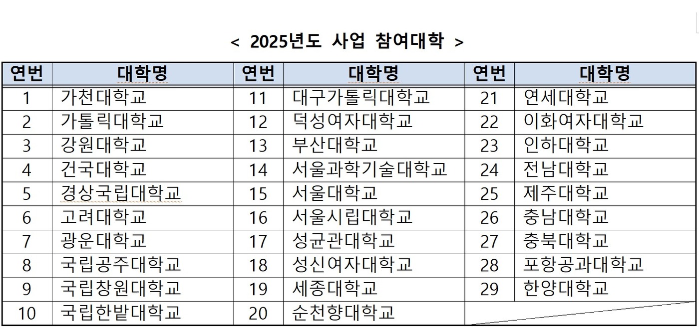 2025년 이공계 연구생활 장려금 사업 참여대학(과학기술정보통신부 제공)