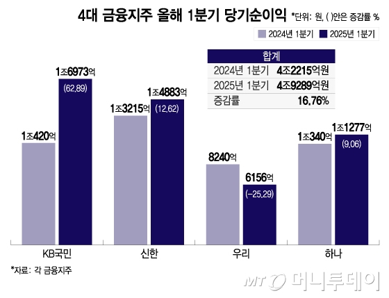 25일 금융권에 따르면 4대금융지주의 올 1분기 당기순이익은 4조9289억원을 기록했다. 지난해 4조2215억원보다 16.7% 증가했다.