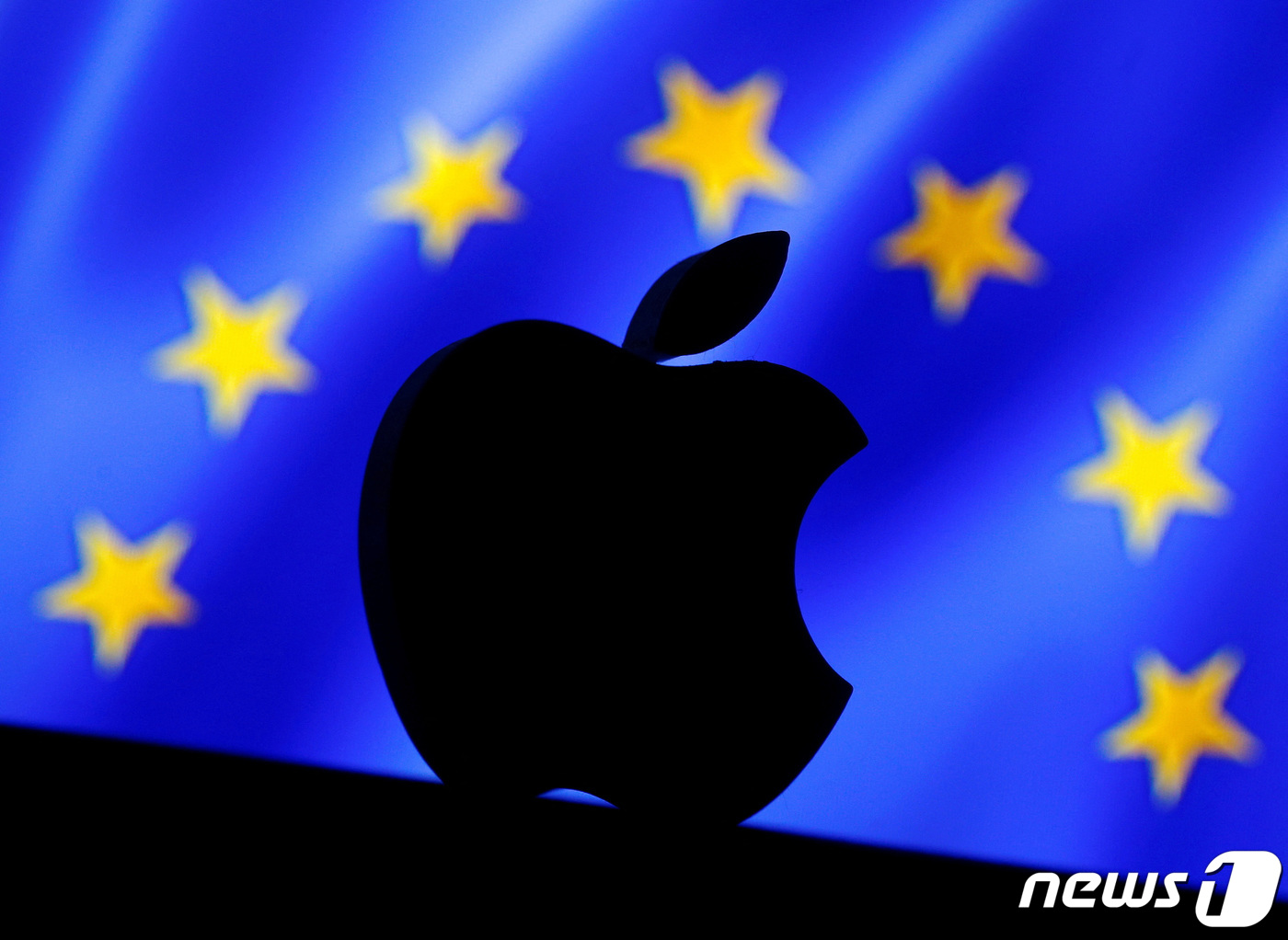 유럽연합(EU) 깃발 앞에 3D 프린터로 인쇄한 애플 로고가 놓여 있다. 2016.9.2 ⓒ 로이터=뉴스1 ⓒ News1 강민경 기자 |