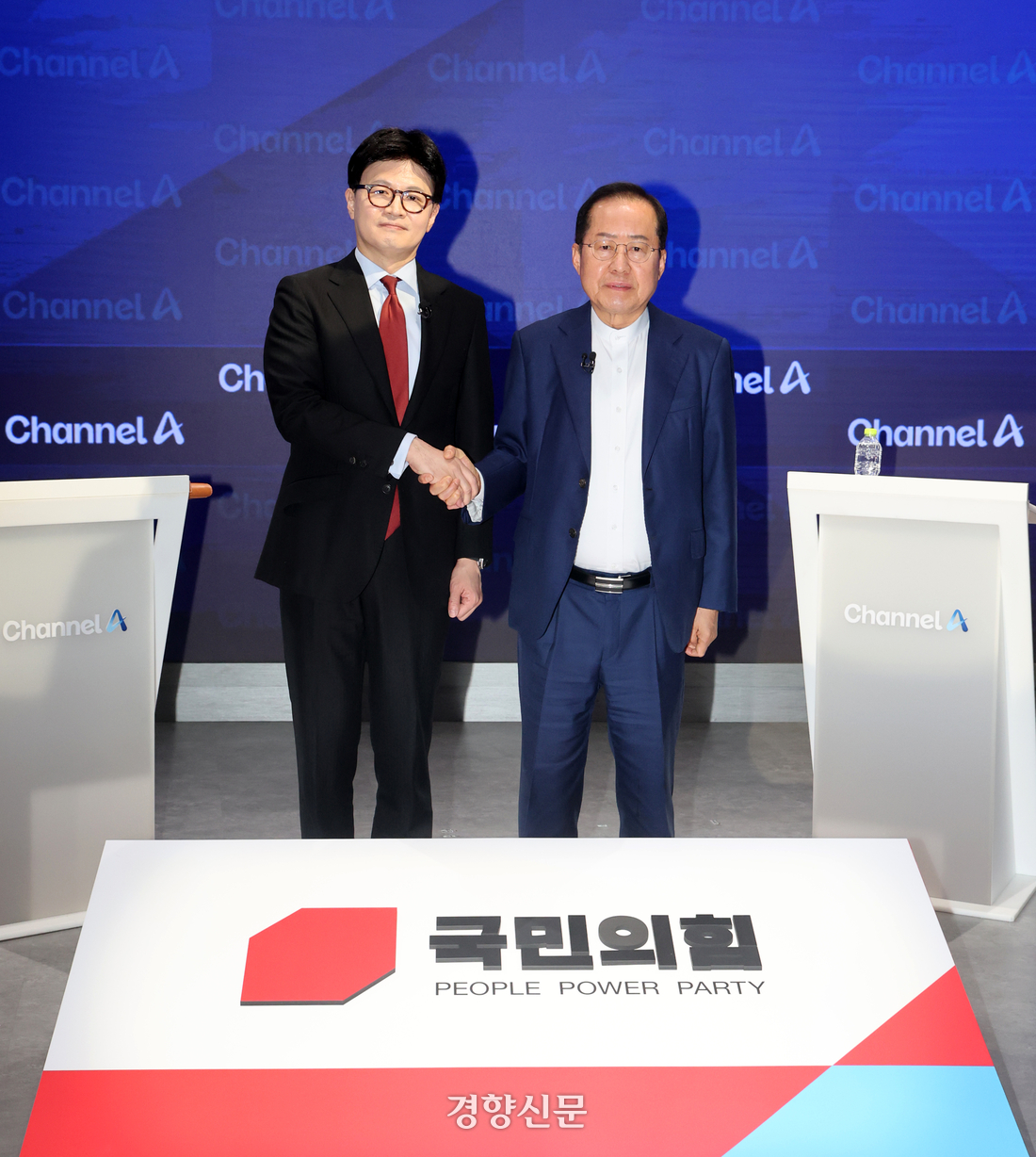 25일 서울 종로구 동아미디어센터 채널A 오픈스튜디오에서 국민의힘 대선 2차 경선 진출자인 한동훈, 홍준표 후보가 방송 전 악수를 하고있다. 국회사진기자단 |