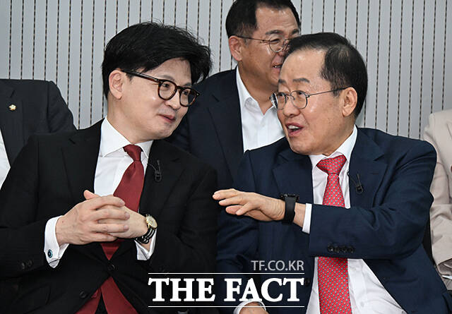 [더팩트ㅣ국회=김수민 기자] 맞수토론 상대로 만난 한동훈·홍준표 국민의힘 대선 경선 후보는 25일 서로를 향해 "깐족대고 있다"고 탓하며 신경전을 벌였다.