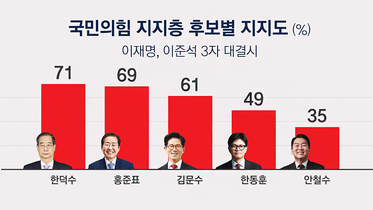 앞서 보신 것처럼 한덕수 대통령 권한대행, 가상 3자 대결에서 민주당 이재명 후보와의 격차가 18%p로 다른 국민의힘 후보들과 비교해 가장 작은 걸로 나타났는데요.