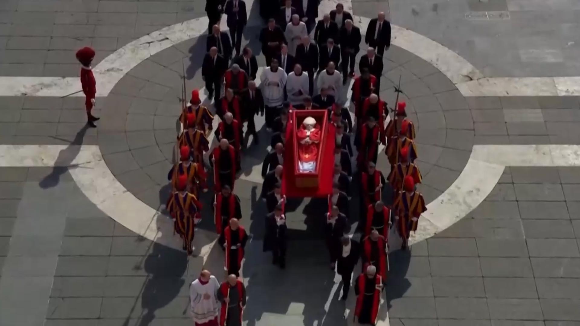 교황의 시신이 놓인 삼나무 관은 생전 업적을 적은 두루마리 등과 함께 장례 미사가 열리는 성베드로 광장으로 옮겨집니다.