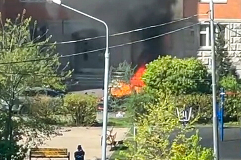 25일 러시아 모스크바 외곽 도시 발라시하에서 차량 폭발 사건이 일어나 검은 연기가 치솟고 있는 모습이 찍힌 동영상 중 한 장면. 이 사건으로 러시아 국방참모본부 작전총국 부국장인 야로슬라프 모스칼릭 중장이 숨졌다. 타스 연합뉴스 |