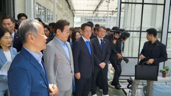 더불어민주당 이재명 대선 경선 예비후보(사진 가운데)가 25일 전남 나주시 전남농업기술원 에너지자립형 스마트팜 연구동을 방문해 여러 시설물을 살펴보고 있다. 심진석 기자 |