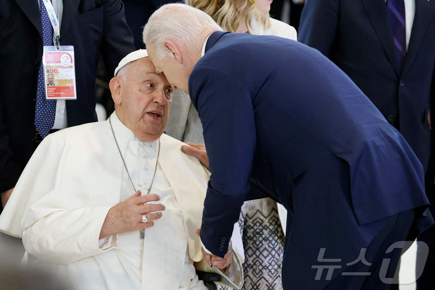 14일 이탈리아 주요7개국(G7) 정상회의 이틀째 실무회의에 참석한 프란치스코 교황이 조 바이든 미국 대통령과 담소를 나누고 있다. 2024.06.14 ⓒ AFP=뉴스1 |