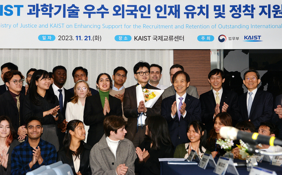 2023년 11월 대전 한국과학기술연구원(KAIST) 본원 글로벌 인재 비자 센터에서 열린 법무부-KAIST 과학기술 우수 외국인 인재 유치 및 정착을 위한 간담회에서 주요 인사들이 기념촬영을 하고 있다. 김성태 객원기자 |