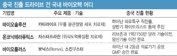 이런 가운데 국내 바이오텍 중 중국 진출을 적극적으로 시도하고 있는 기업이 재평가될지 관심이다. 현재 중국 진출이 임박했거나 기술이전에 성공한 기업으로는 바이오솔루션(086820)과 온코닉테라퓨틱스(476060) 바이오플러스(099430)가 꼽힌다.
