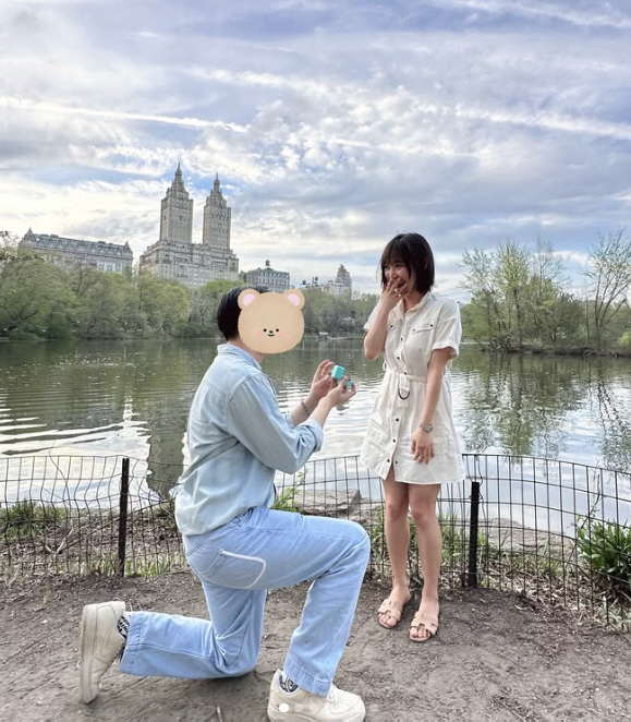 공개된 사진에는 뉴욕 센트럴파크에서 민이 예비 신랑에게 프러포즈를 받는 모습이 담겼다. 예비 신랑은 한쪽 무릎을 꿇고 반지를 건네며 사랑을 고백했고, 민은 전혀 예상하지 못한 듯 손으로 입을 가린 채 함박웃음을 지으며 감격스러운 순간을 만끽했다.