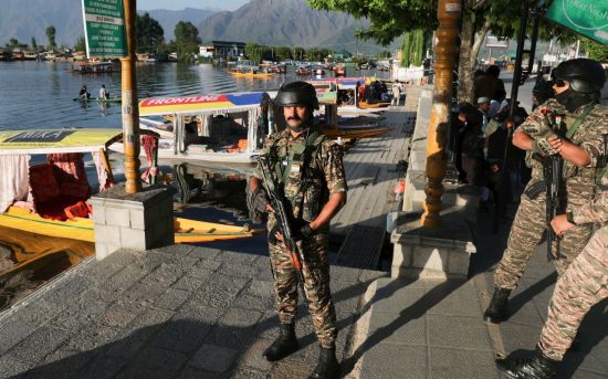 카슈미르서 경계근무 중인 인도군 병력. 지난 25일(현지시간) 인도 북부 인도령 카슈미르 스리나가르에서 인도군 병력이 경계근무를 서고 있다. |