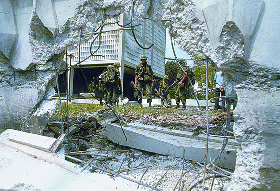 1968년 1월 북베트남 게릴라 베트콩에 의해 남베트남 후방 깊숙이 위치한 사이공 주재 미국 대사관까지 공격 당했다. 당시 전투로 큰 구멍이 뚫린 미국 대사관 담장. [중앙포토] |