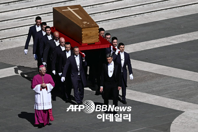 26일 오전 10시(한국시간 오후 5시) 바티칸 성 베드로 대성전에 안치돼 있는 프란치스코 교황의 관이 성 베드로 대광장으로 운구되고 있다. (사진=AFP) |