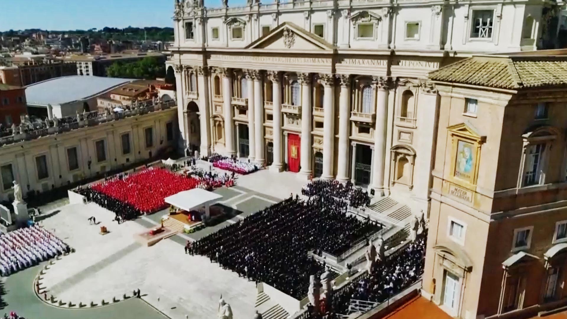 교황의 목관이 안치돼 있던 성 베드로 대성당 안에서 붉은 옷을 입은 추기경들이 양쪽으로 늘어선 가운데, 영원한 안식을 기원하는 입당송과 함께 교황의 시신이 안치된 목관이 성 베드로 광장 야외 제단으로 운구됐습니다.