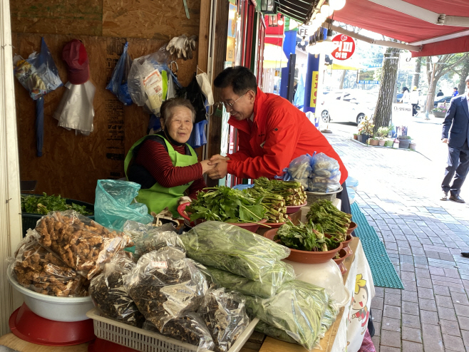 전진선 양평군수가 지난 25일 오전 '제15회 용문산 산나물 축제' 개회식에 앞서 각 부스를 돌며 축제에 참여한 상인들과 인사를 나누고 있다./장은기 기자