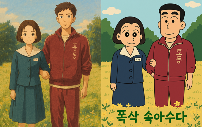 지브리(왼쪽)와 짱구풍으로 제작한 넷플릭스 오리지널 드라마 폭싹 속았수다 포스터. [사진 = 챗GPT] |