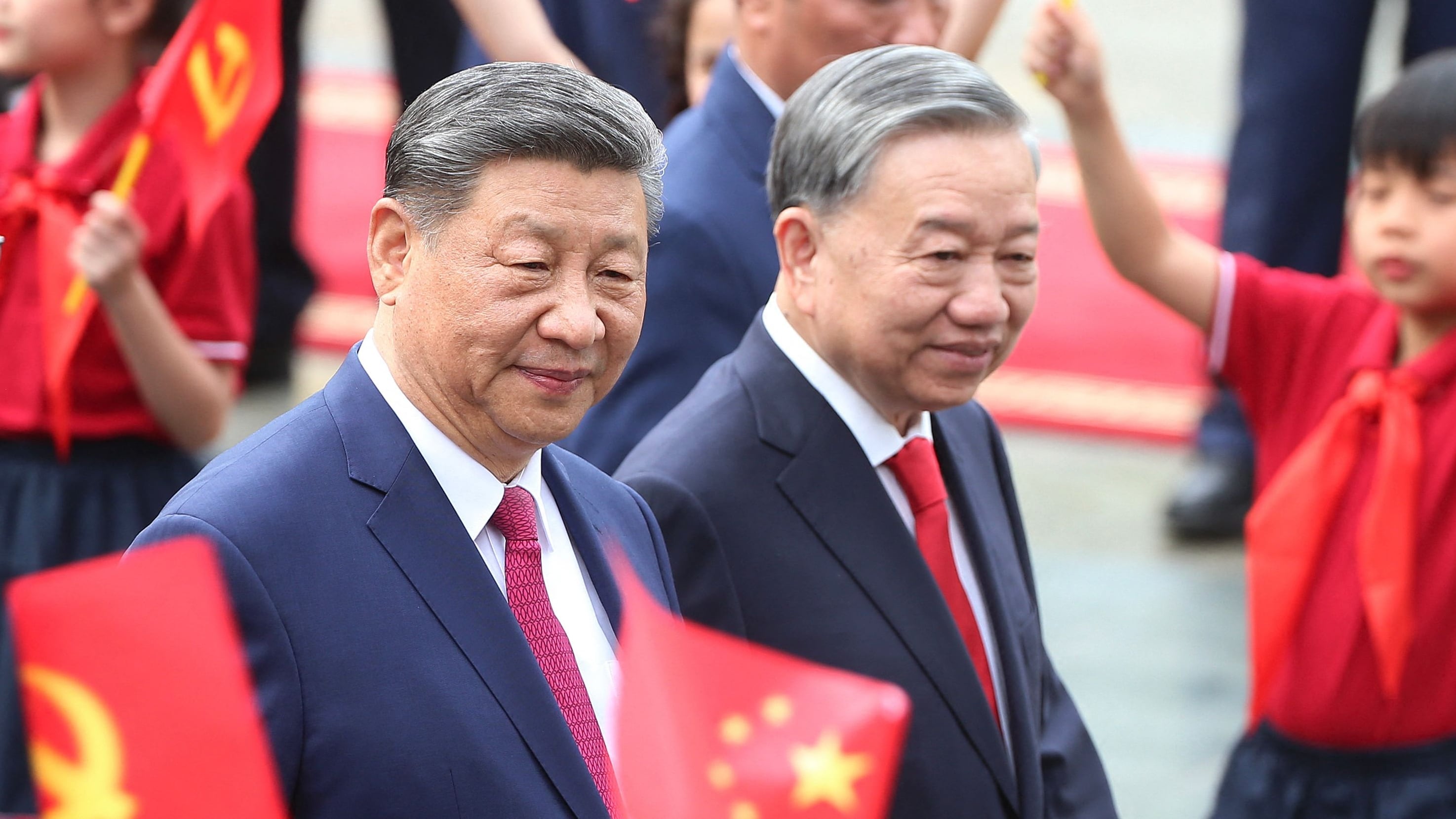 베트남 공산당 서기장 토람(오른쪽)이 지난 14일 하노이 주석궁에서 열린 공식 환영식에서 시진핑 중국 국가주석을 맞이하고 있다./AFP 연합뉴스 |