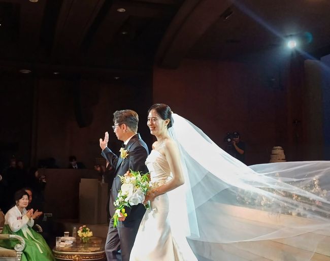 공개된 사진 속에는 결혼식에서 심현섭이 혼주석을 바라보며 손을 흔들고 있는 모습이 담겼다. 이날 혼주석에는 먼저 세상을 떠난 심현섭의 부모님 대신 외삼촌과 외숙모가 자리했다.