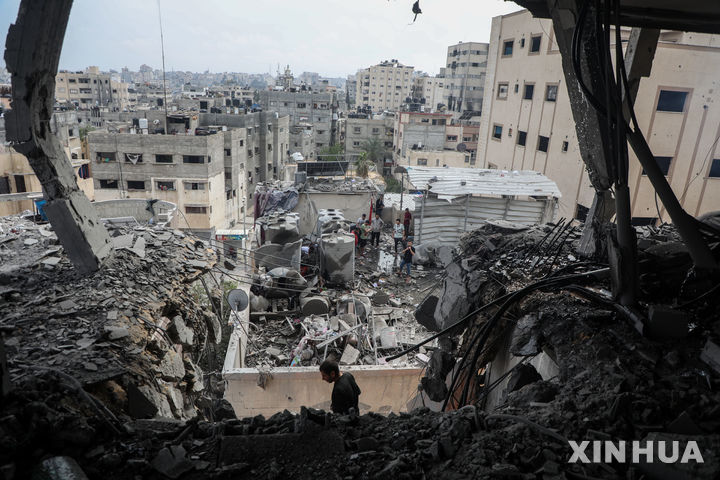 [가자시티=신화/뉴시스] 4월 24일 가자지구 가자시티에서 팔레스타인 주민들이 이스라엘의 공습으로 파괴된 주거용 건물을 살펴보고 있다. 팔레스타인 민방위 당국은 26일에도 가자지구 전역에서 이스라엘 공습으로 최소 34명의 팔레스타인민간인이 사망했다고 밝혔다. 2025.04.27. |