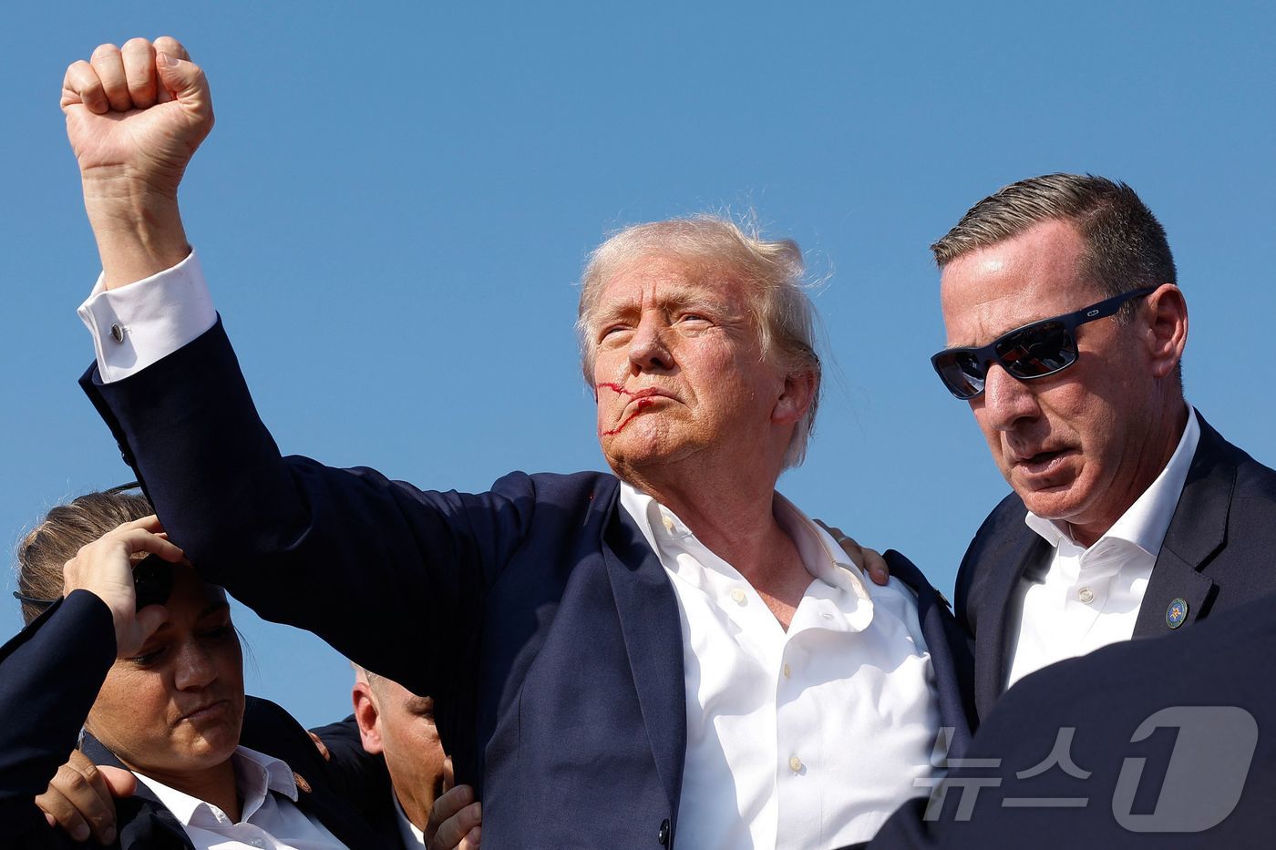 도널드 트럼프 전 미국 대통령이 13일 (현지시간) 펜실베이니아주 버틀러에서 열린 선거 집회서 유세를 하던 중 총격 사건이 발생해 얼굴에 핏자국이 묻은 채로 주먹을 불끈 쥐고 있다. 2024.07.14 ⓒ AFP=뉴스1 ⓒ News1 우동명 기자 |