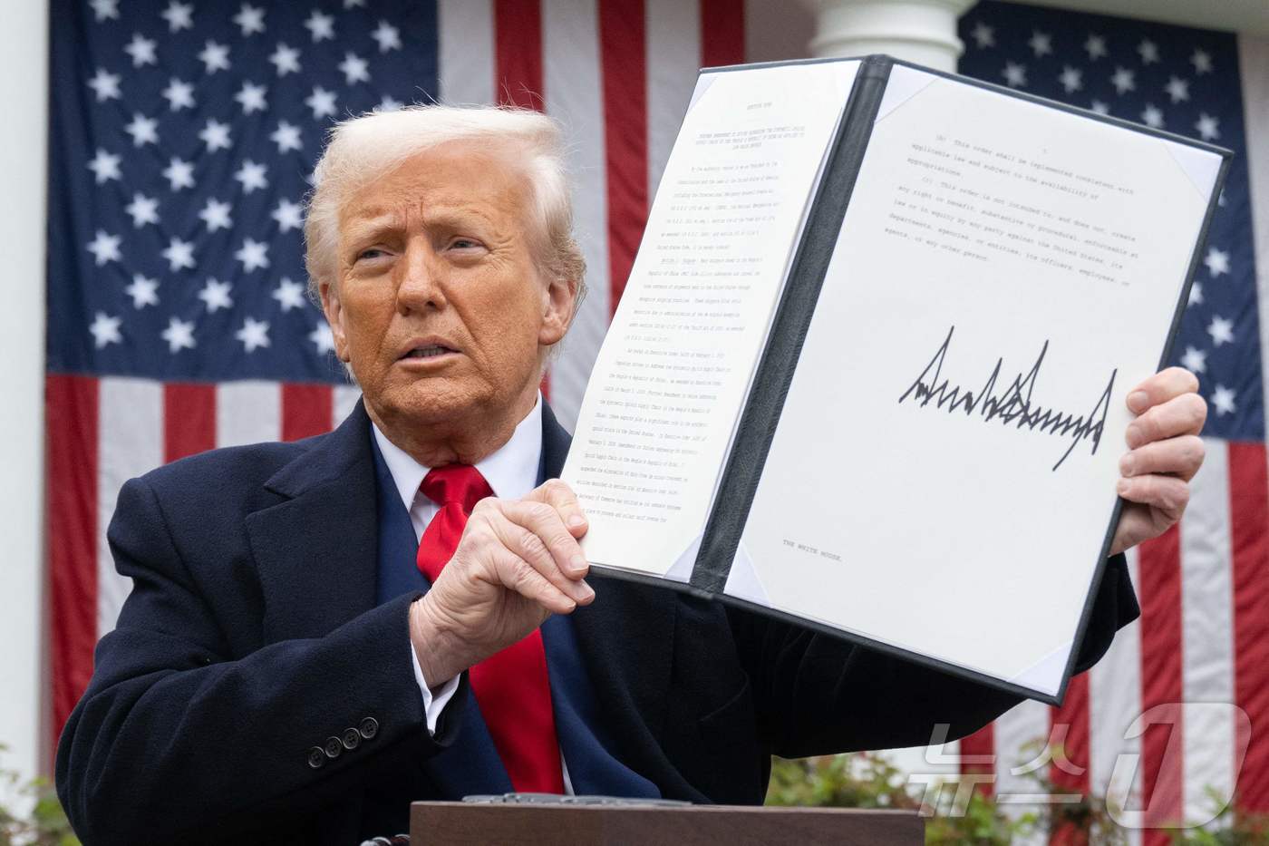 도널드 트럼프 미국 대통령이 지난 2일(현지시간) 워싱턴DC 백악관에서 열린 '미국을 다시 부유하게' 행사에서 상호관세 관련 연설을 한 뒤 서명한 행정명령을 들어 보이고 있다. ⓒ AFP=뉴스1 |
