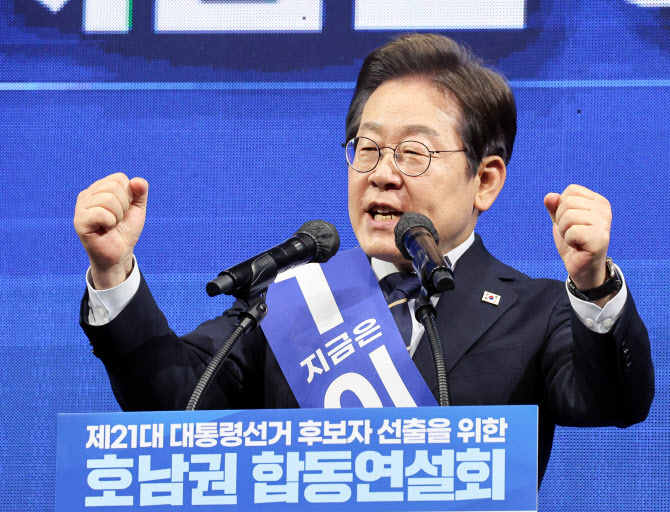 이재명 더불어민주당 대선 경선 후보가 26일 오후 광주 서구 김대중컨벤션센터에서 열린 호남권 합동연설회에서 연설을 하고 있다. (사진=뉴스1) |