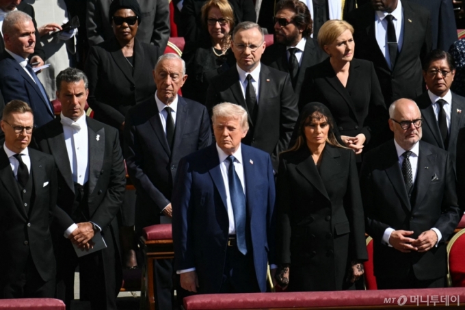 (AFP=뉴스1) = 도널드 트럼프 미국 대통령과 멜라니아 트럼프 여사를 비롯한 해외 정상들이 26일 오후(현지시간) 바티칸 성 베드로 광장에서 열린 프란치스코 교황의 장례 미사에 참석해 있다. ⓒ AFP=뉴스1 Copyright (C) 뉴스1. All rights reserved. 무단 전재 및 재배포, AI학습 이용 금지. /사진=(AFP=뉴스1) |