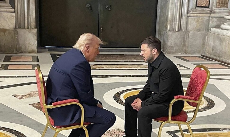 26일(현지시각) 도널드 트럼프 미국 대통령이 로마에서 열린 교황 프란치스코 장례식 중 볼로디미르 젤렌스키 우크라이나 대통령과 만났다. 이날 만남은 지난 2월 백악관에서 격렬한 설전 뒤 첫 대면이었다. 만남 뒤 트럼프 대통령은 블라디미르 푸틴 러시아 대통령의 평화 의지에 의문을 제기했다.