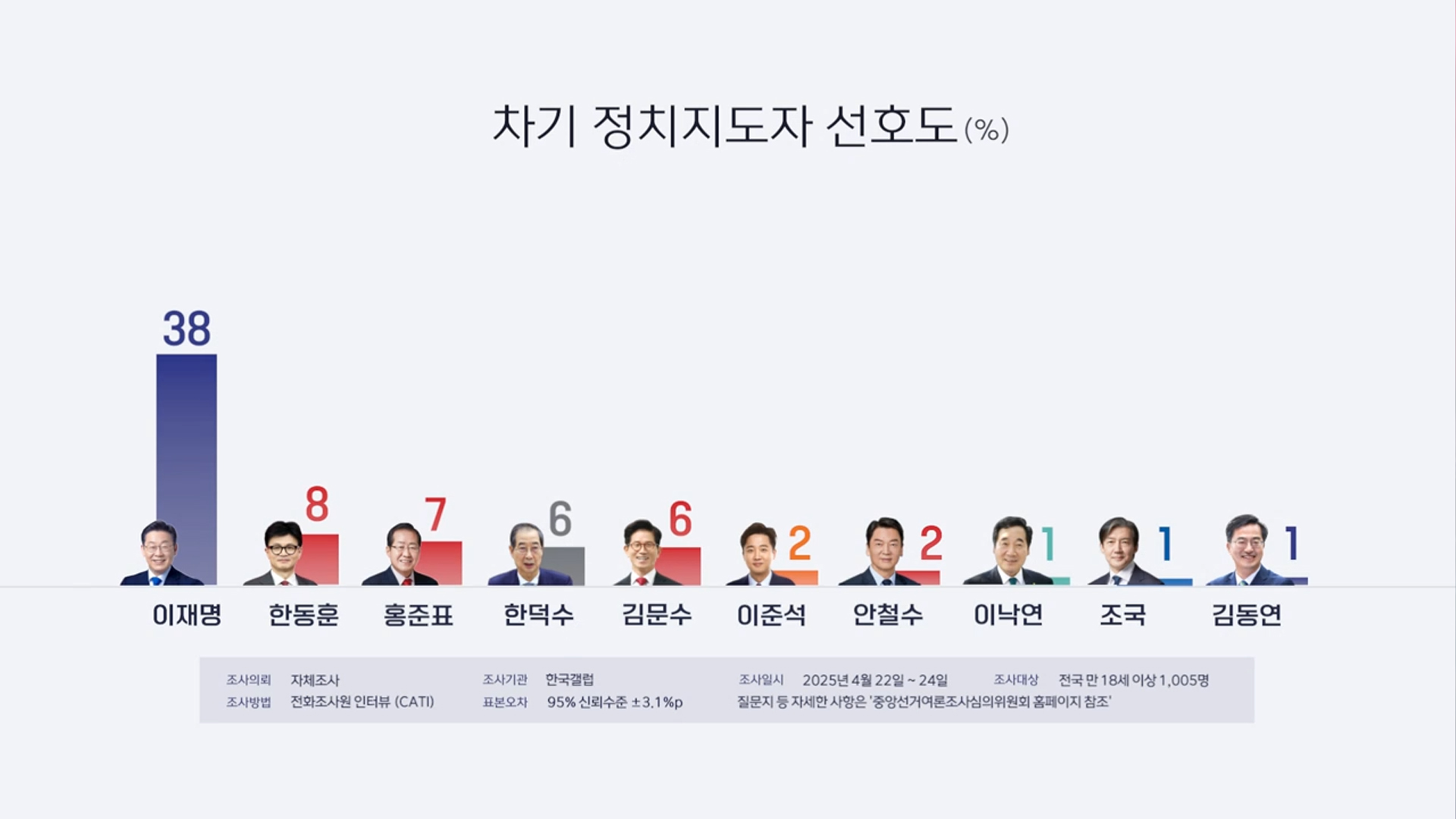 한국갤럽이 지난 22~24일 전국 만 18세 이상 유권자 1,005명을 대상으로 조사한 결과, 이재명 후보는 38%를 기록했습니다.