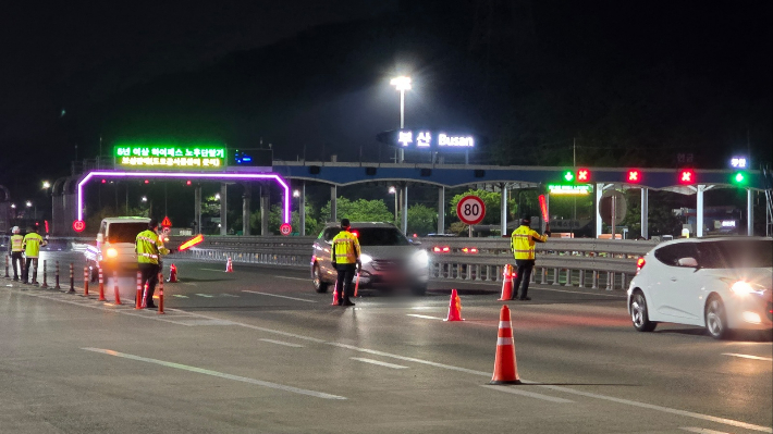 부산경찰이 고속도로 톨게이트에서 음주단속을 실시하고 있다. 부산경찰청 제공 |