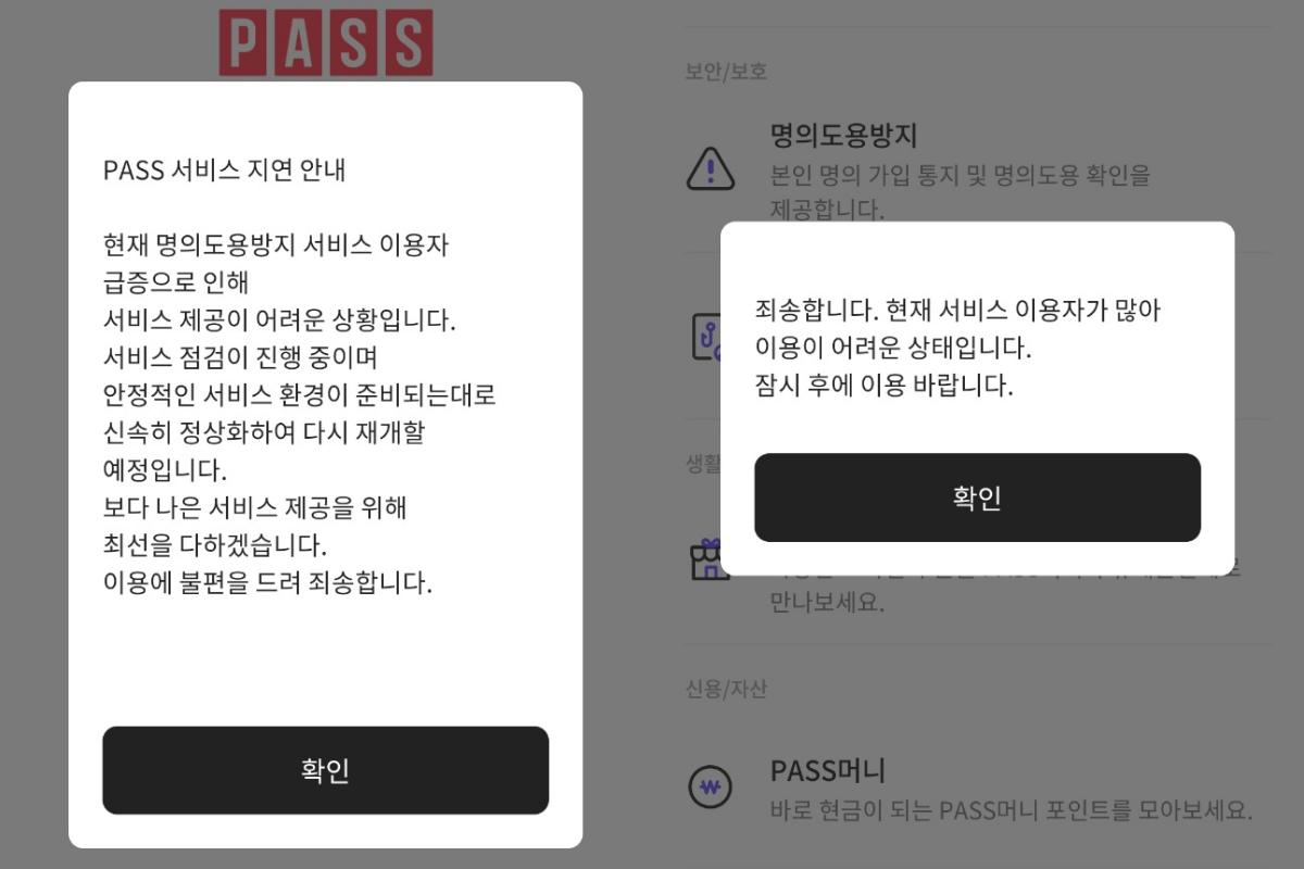 본인인증서비스 패스(PASS)가 '명의 도용 방지' 서비스 이용자 급증으로 서비스 제공을 중단, 점검을 진행 중이다.