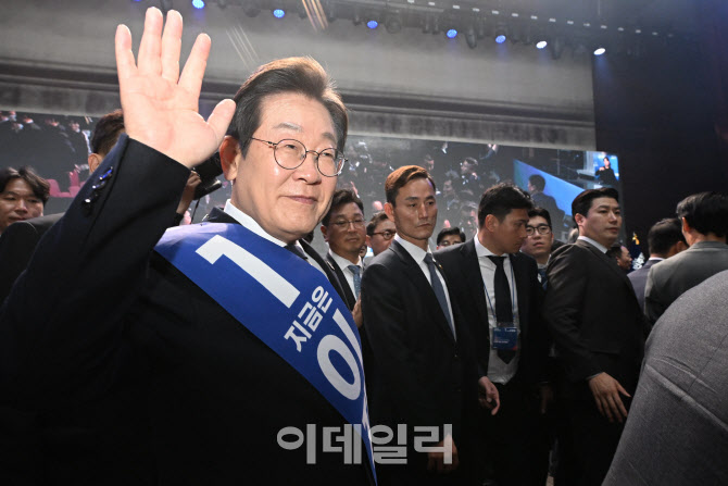 이재명 더불어민주당 대선 경선후보가 지난 26일 오후 광주 서구 김대중컨벤션센터에서 열린 더불어민주당 21대 대통령선거 후보자 선출을 위한 호남권 합동연설회 종료 직후 지지자들을 향해 손을 흔들고 있다. 이 후보는 이날 마무리된 호남권 경선 결과 88.69%로 압승했다. (사진=뉴시스)