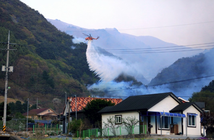 지난 26일 강원 인제에서 진화 헬기가 산불 진화 작업을 벌였다. 인제군 제공 |
