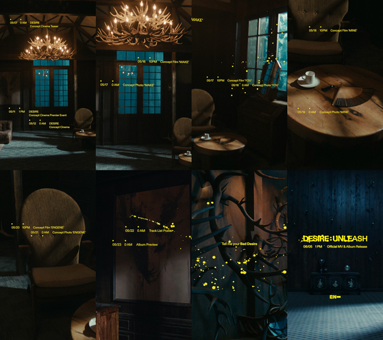 엔하이픈(정원, 희승, 제이, 제이크, 성훈, 선우, 니키)은 27일 0시 하이브 레이블즈 공식 유튜브 채널에 6월 5일 발매 예정인 미니 6집 'DESIRE : UNLEASH'의 프로모션 캘린더를 게재했다. 영상 속 공간은 공포스러우면서도 미스터리한 분위기가 물씬 풍기는 가운데, 화면 사이사이 콘텐츠 공개 일정이 차례로 등장해 앨범에 대한 기대감을 높였다. 특히 1인칭 시점으로 이 공간을 돌아다닌 듯한 연출을 통해 짧지만 강력한 몰입감을 형성했다.