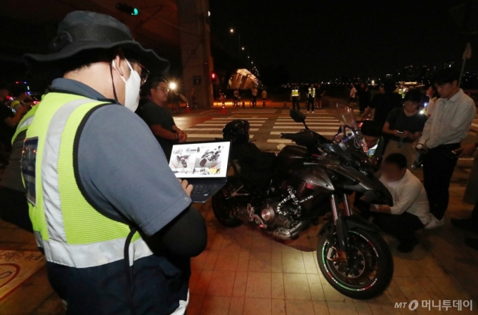 (서울=뉴스1) 박세연 기자 = 광복절을 하루 앞둔 14일 오후 서울 잠수교 북단에서 실시된 서울경찰청 8.15 광복절 대비 폭주족 특별단속에서 한 오토바이 운전자가 불법 튜닝으로 단속에 걸리고 있다. 2024.8.14/뉴스1 Copyright (C) 뉴스1. All rights reserved. 무단 전재 및 재배포, AI학습 이용 금지. /사진=(서울=뉴스1) 박세연 기자 |