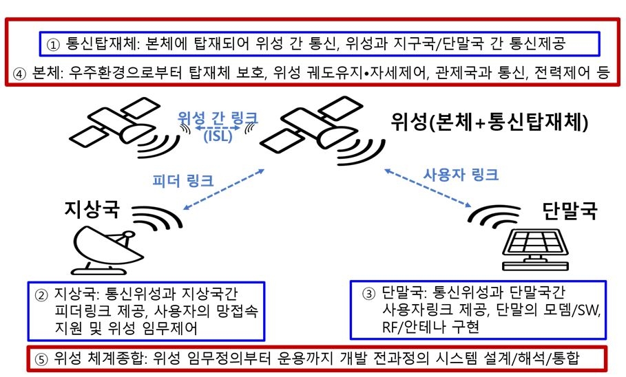 저궤도 위성통신 개발 사업은 저궤도 통신위성 2기와 지상국·단말국으로 구성된 저궤도 위성통신 시스템을 구축하는 것이다. 위성과 지상 간, 위성과 위성 간 통신 기능을 수행하는 통신 탑재체와 위성 종합체계 등이 만들어질 예정이다.