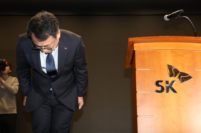 [서울=뉴스핌] 양윤모 기자 = 최근 SK텔레콤이 해킹 공격으로 고객의 유심(USIM) 정보 일부가 외부로 유출된 정황이 포착된 가운데, 유영상 SKT 대표이사가 25일 오전 SK텔레콤 T타워 4층 SUPEX홀에서 열린 SK텔레콤 고객 정보 보호조치 강화 관련 언론설명회에 참석 고개숙여 사과를 하고 있다. 2025.04.25 yym58@newspim.com |