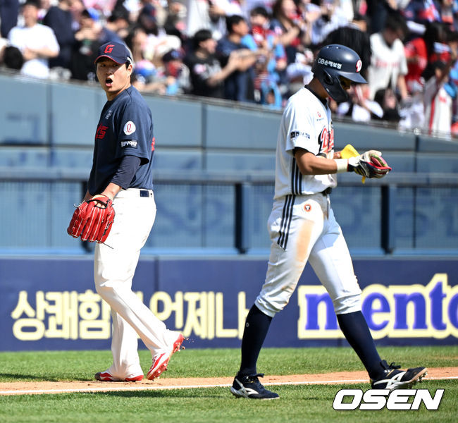 4회말 나균안은 선두타자 오명진에게 또다시 안타를 허용한 무사 1루 위기에서 또다시 김민석을 만났다. 나균안은 김민석의 허를 찌르며 3구까지 유리한 볼카운트를 가져갔다. 하지만 4구째 낮은 볼을 배트를 쭉 뻗어 우전안타로 만든 김민석의 콘택트 능력에 고개를 떨굴 수밖에 없었다.