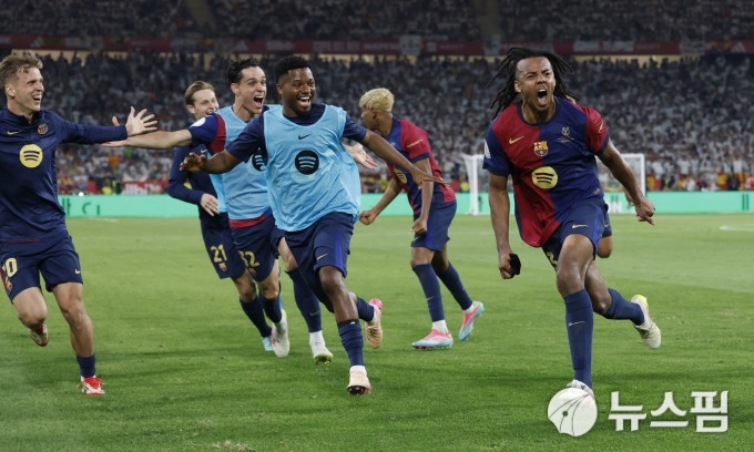 [세비야 로이터 =뉴스핌] 박상욱 기자 = 쥘 쿤데(오른쪽)가 27일 코파 델 레이 결승전에서 연장 후반 결승골을 넣고 동교들과 기뻐하고 있다. 2025.4.27 psoq1337@newspim.com |